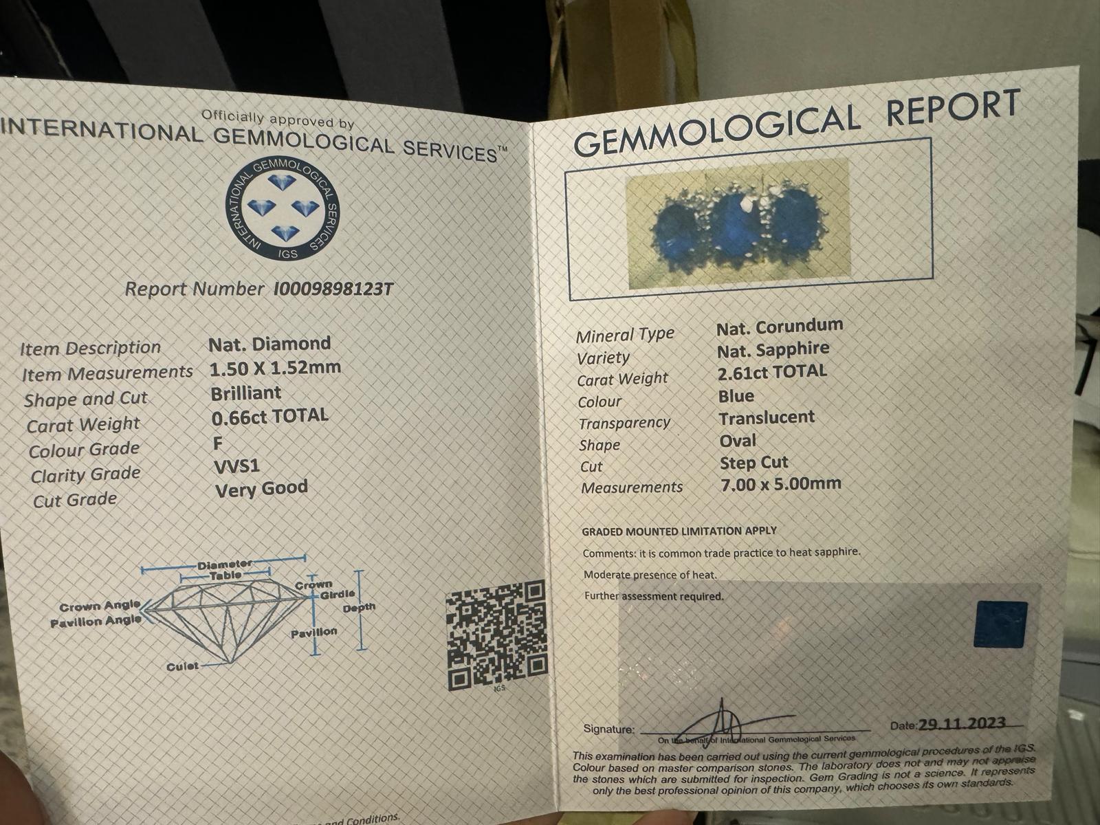 Caramaci Diamonds garantează autenticitatea pietrelor prețioase prin certificate internaționale recunoscute. Safirul și diamantele din acest inel au fost evaluate de International Gemmological Services (IGS), Londra.