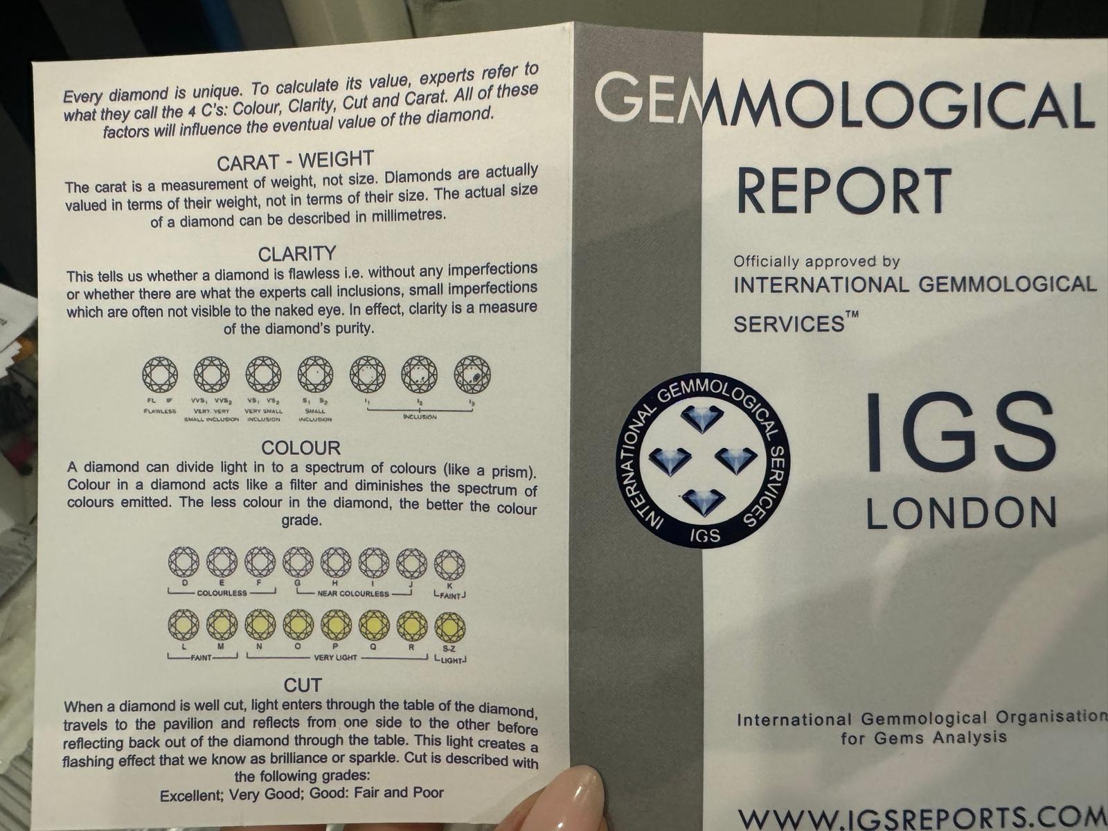 Bijuteria este certificată IGS London și este însoțită de garanția Caramaci Diamonds, oferindu-ți siguranța calității și a autenticității fiecărei pietre prețioase.