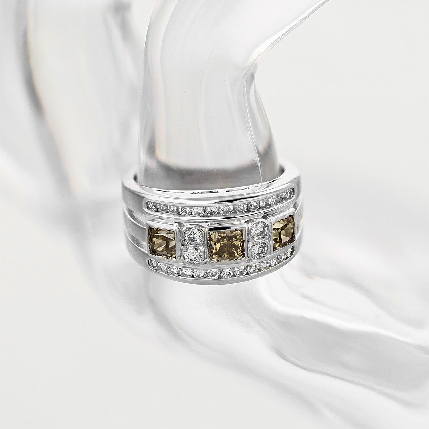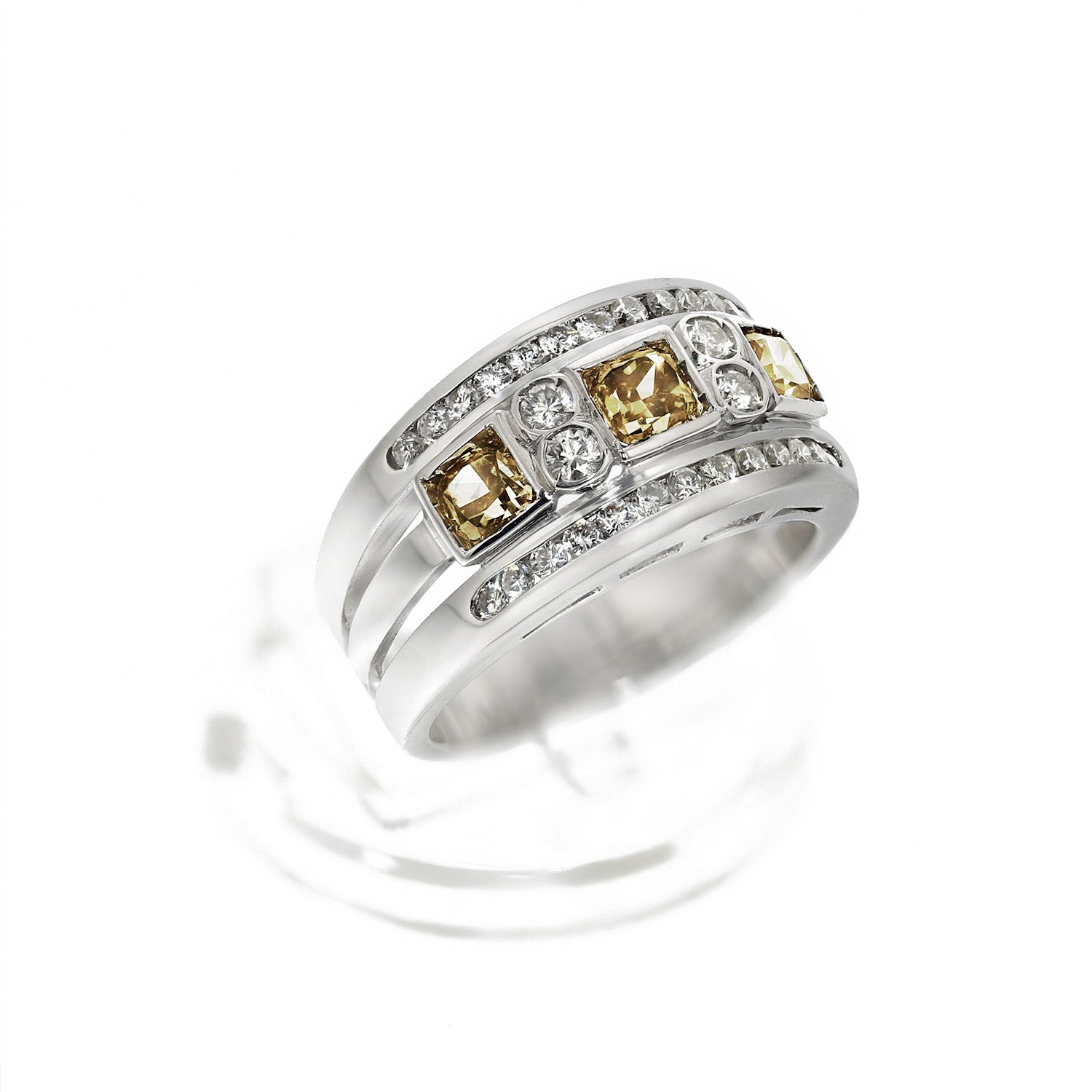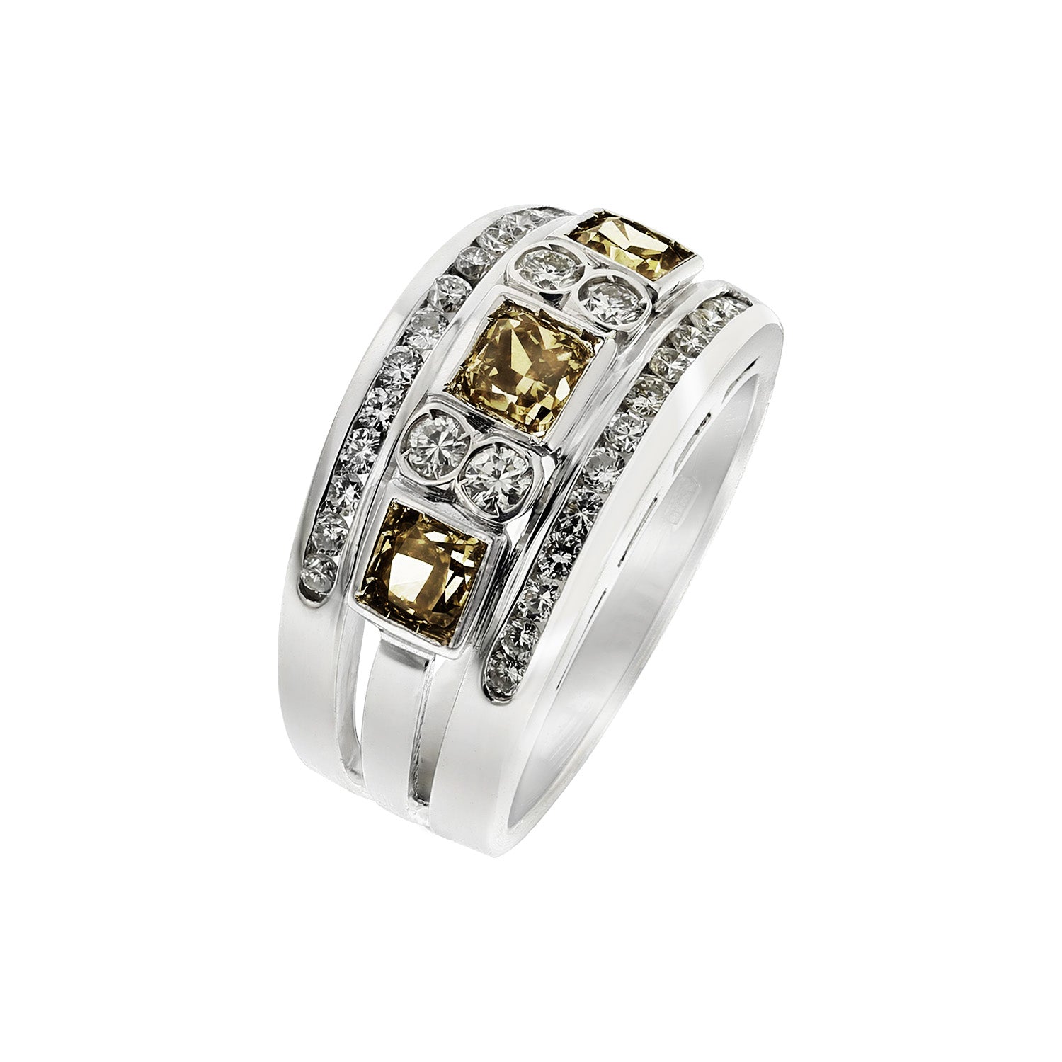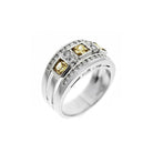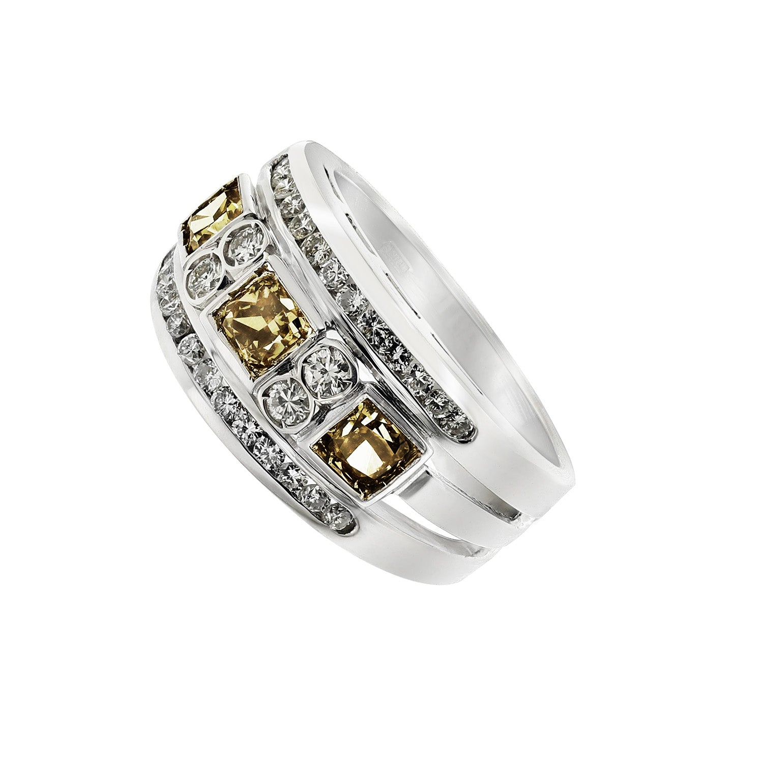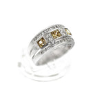 Made of white gold, this ring features 3 gold diamonds, 4 diamond medium, and 26 diamond separate on 2 rows. Elevate your style with this bold and daring statement piece. A must-have for any adventurer.